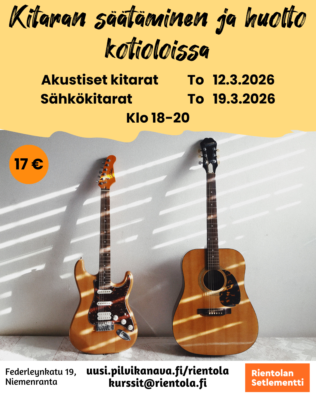 Kevät on mainiota aikaa huoltaa kitara ja antaa sen soida taas kauniisti! Rientolan kursseilla käydään läpi perusasiat akustisen- ja sähkökitaran kunnossapidosta ja säätämisestä. Kurssi akustisen…