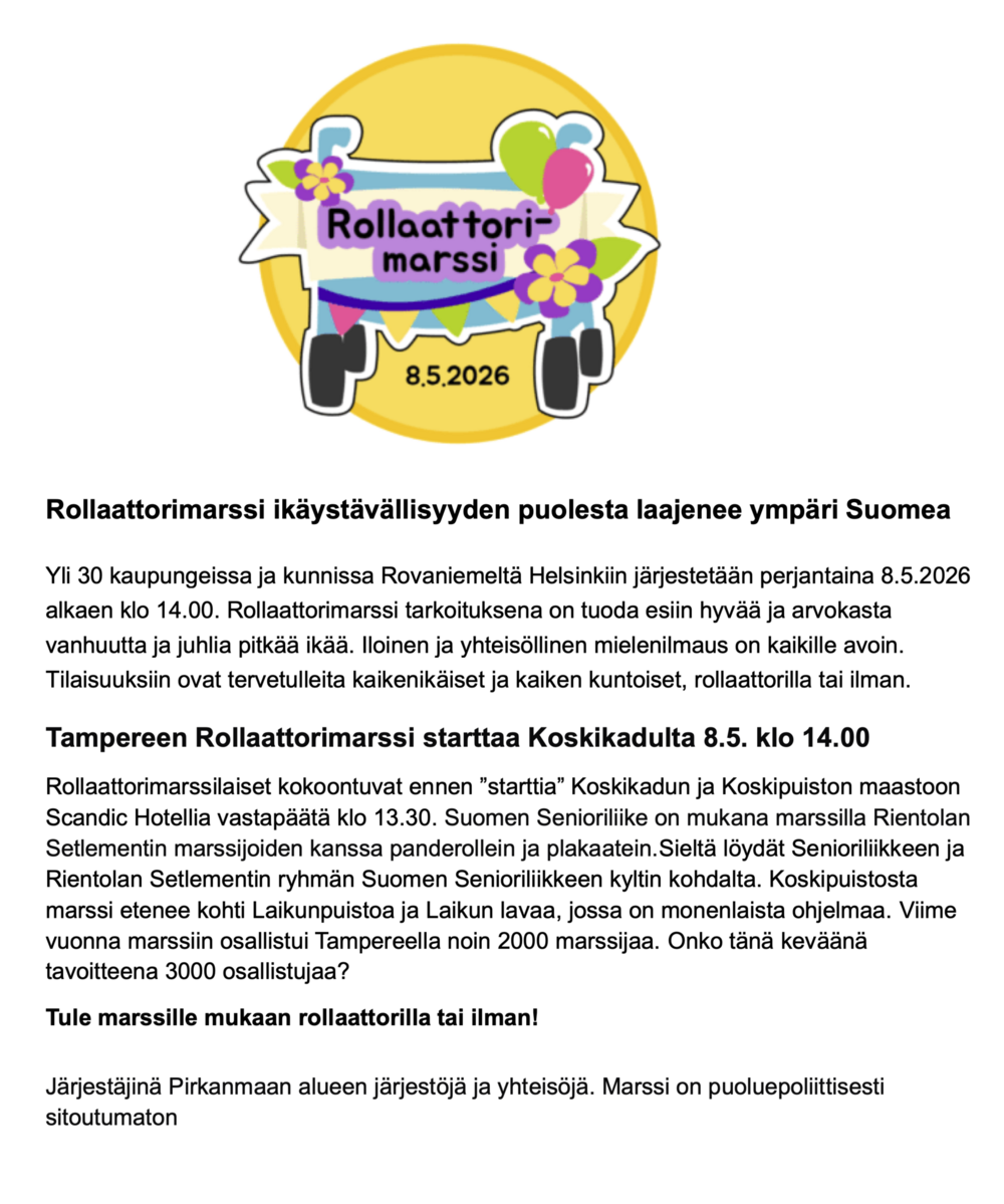 Hei, Tervetuloa Rientolan Pirtille huomenna 4.3.2026 klo 14:30! Keskustelemme ikäihmisten hyvinvoinnista ja siihen liittyvistä asioista, kuten palvelujärjestelmästä ym. Pirhan vanhusneuvoston…