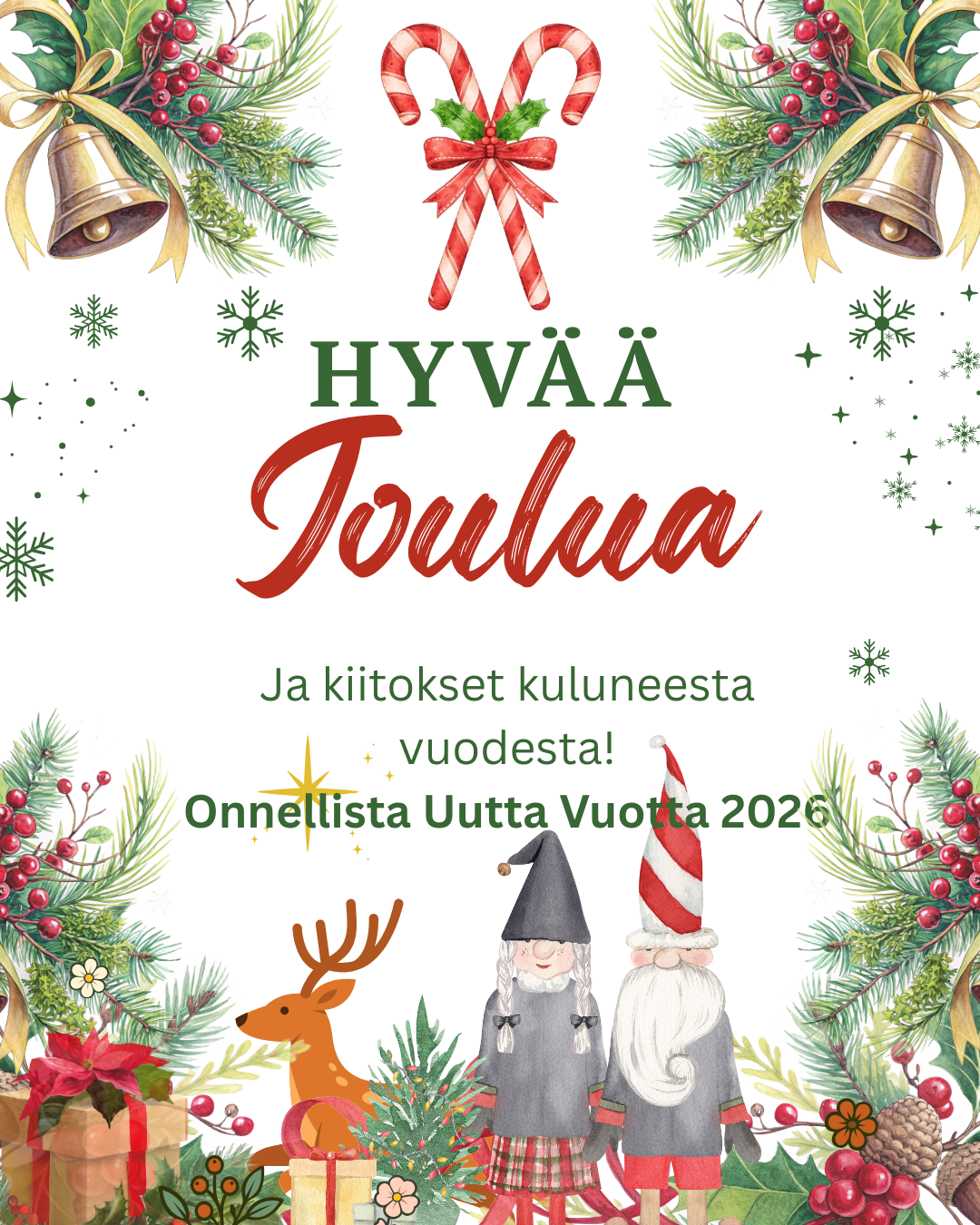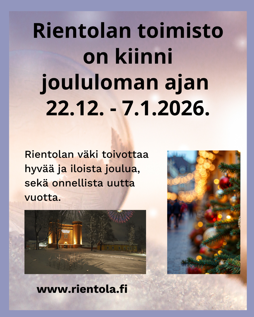 Toimisto jää joululomalle 22.12.2025 ja palaa 7.1.2026. Rientola kiittää kuluneesta vuodesta ja toivottaa kaikille hyvää joulua, sekä onnellista uutta vuotta.