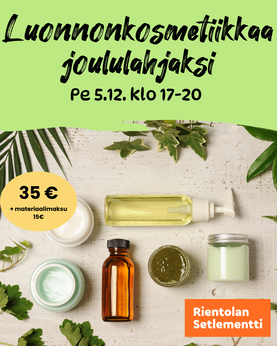 Kurssilla valmistetaan erilaisia luonnonkosmetiikan tuotteita villiyrteistä ja luonnon raaka-aineista. Lopuksi teemme tuotteille vielä etiketit ja paketoimme valmiiksi pukinkonttiin.