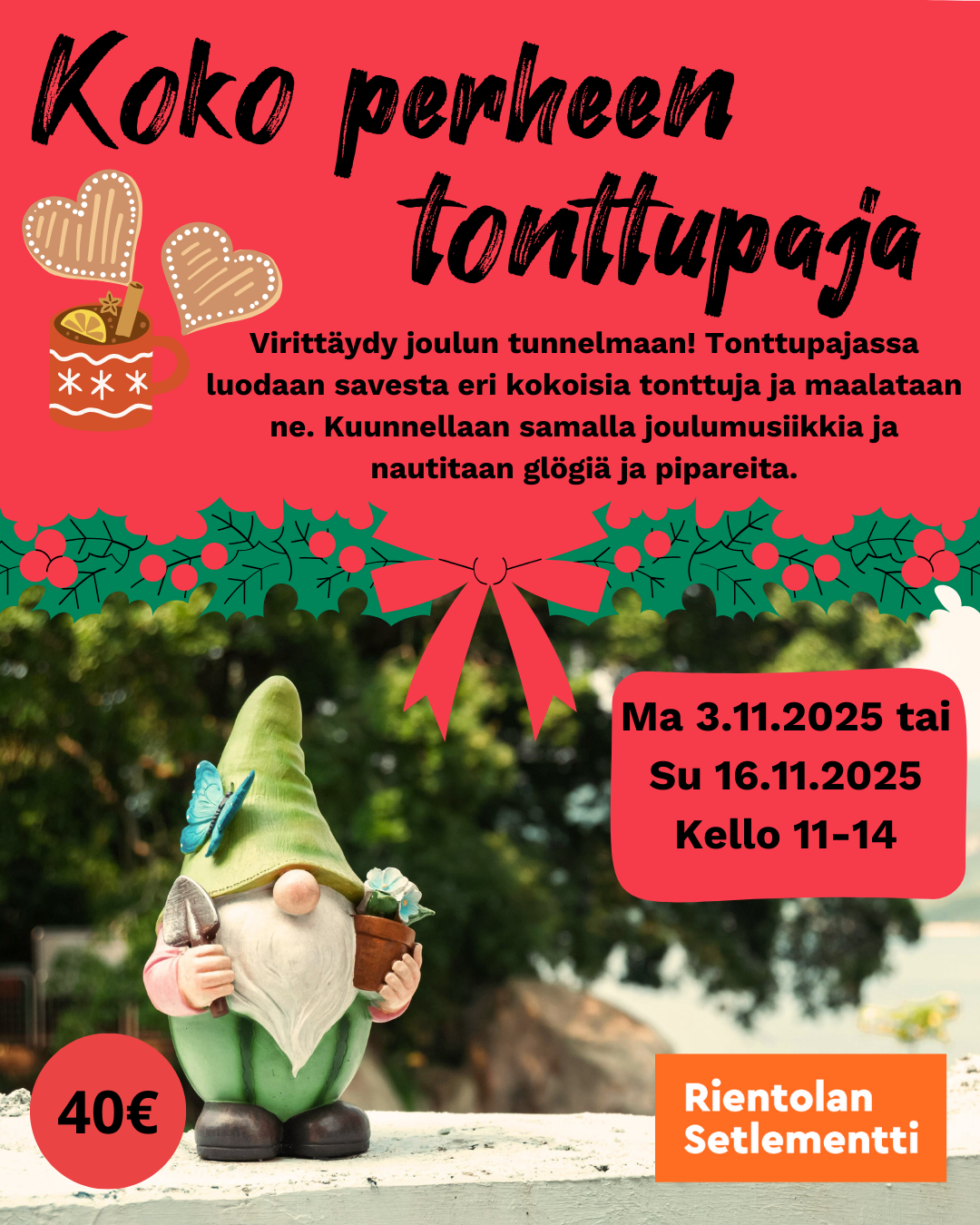 Tervetuloa tähän jouluiseen koko perheen tonttujen valmistuspajaan! Luvassa taattua joulutunnelmaa: kuunnellaan joulumusiikkia ja glögiä & pipariakin on tarjolla.