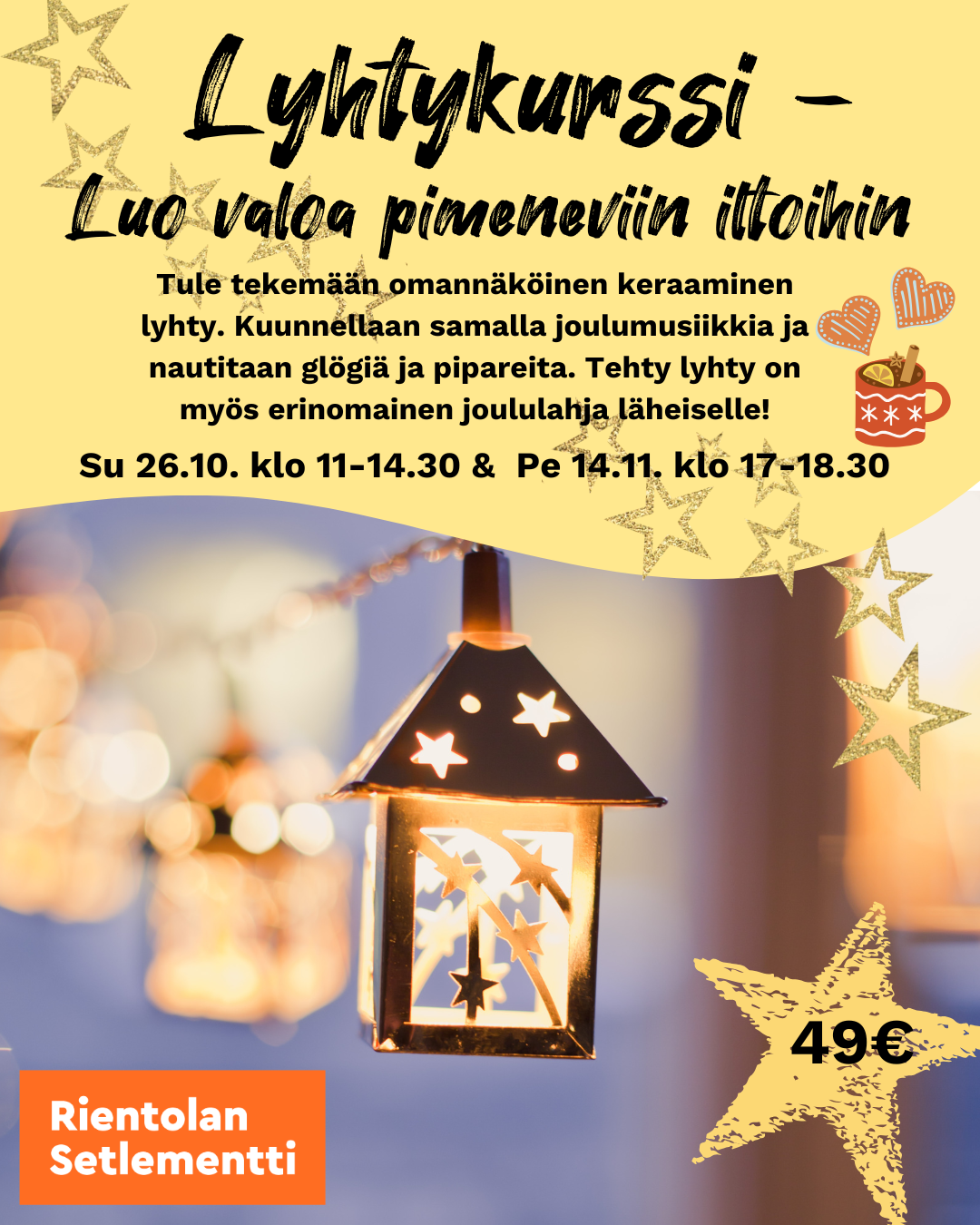 Tule tekemään omannäköinen keraaminen lyhty. Kurssilla ehdit tekemään yhden ison lyhdyn tai kaksi pientä. Kuunnellaan samalla joulumusiikkia ja nautitaan glögiä ja pipareita.