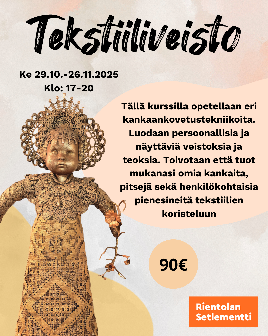 Aikoinaan valmistettiin koriste- ja käyttöesineitä kovettamalla tekstiilejä esim. Pitsiliinoista kulhoja jne. Nyt jotain paljon rohkeampaa! Tällä kurssilla opetellaan eri kankaankovetustekniikoita.