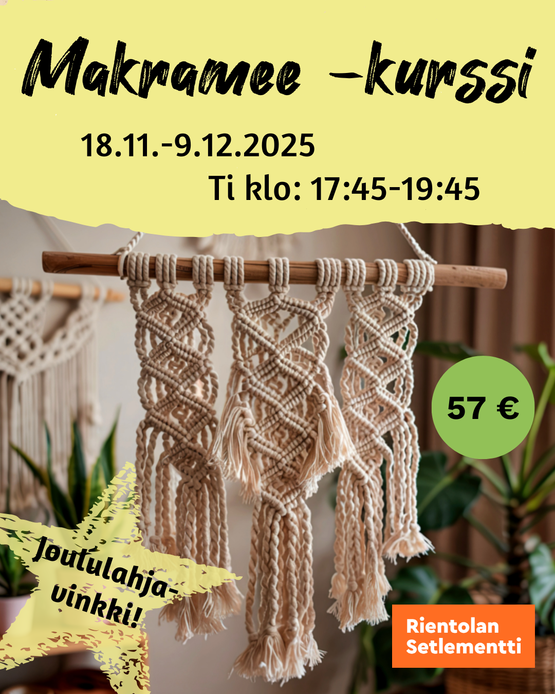 Oletko sinäkin kiinnostunut suositusta solmeilusta? Tule matalalla kynnyksellä kokeilemaan amppeli, seinävaate, korut, vyö, hylly ja paljon muuta.