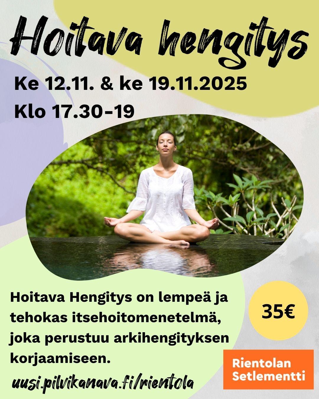 Hoitava Hengitys on lempeä ja tehokas itsehoitomenetelmä, joka perustuu arkihengityksen korjaamiseen. Kurssi sisältää teoriaa, hengitysharjoituksia ja kielijumppaa.