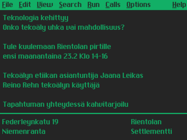 Tule kuulemaan tekoälystä Rientolan pirtille maanantaina 23.2 klo 14-16. Mukana tapahtumassa VTT:n tekoälyn etiikan asiantuntija Jaana Leikas ja tekoälyn käyttäjä Reino Rehn. Tapahtuman yhteydessä…
