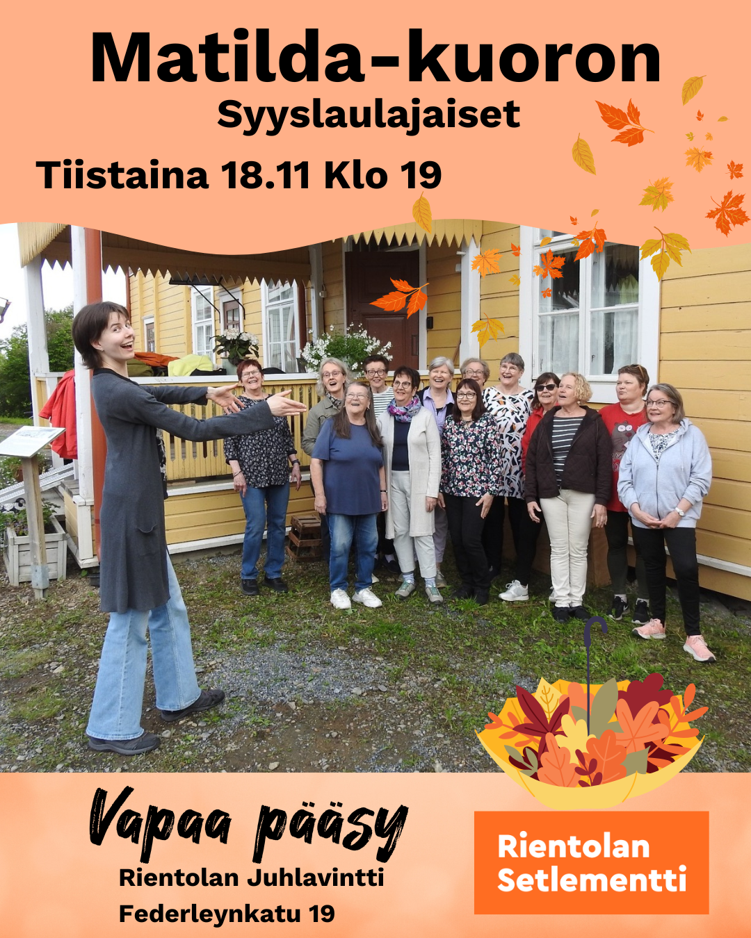 Rientolan Matilda-kuoron syyslaulajaiset tiistaina 18.11 klo 19:00 Rientolan Juhlavintillä. Tapahtumaan on vapaa pääsy ja se kestää noin puoli tuntia.