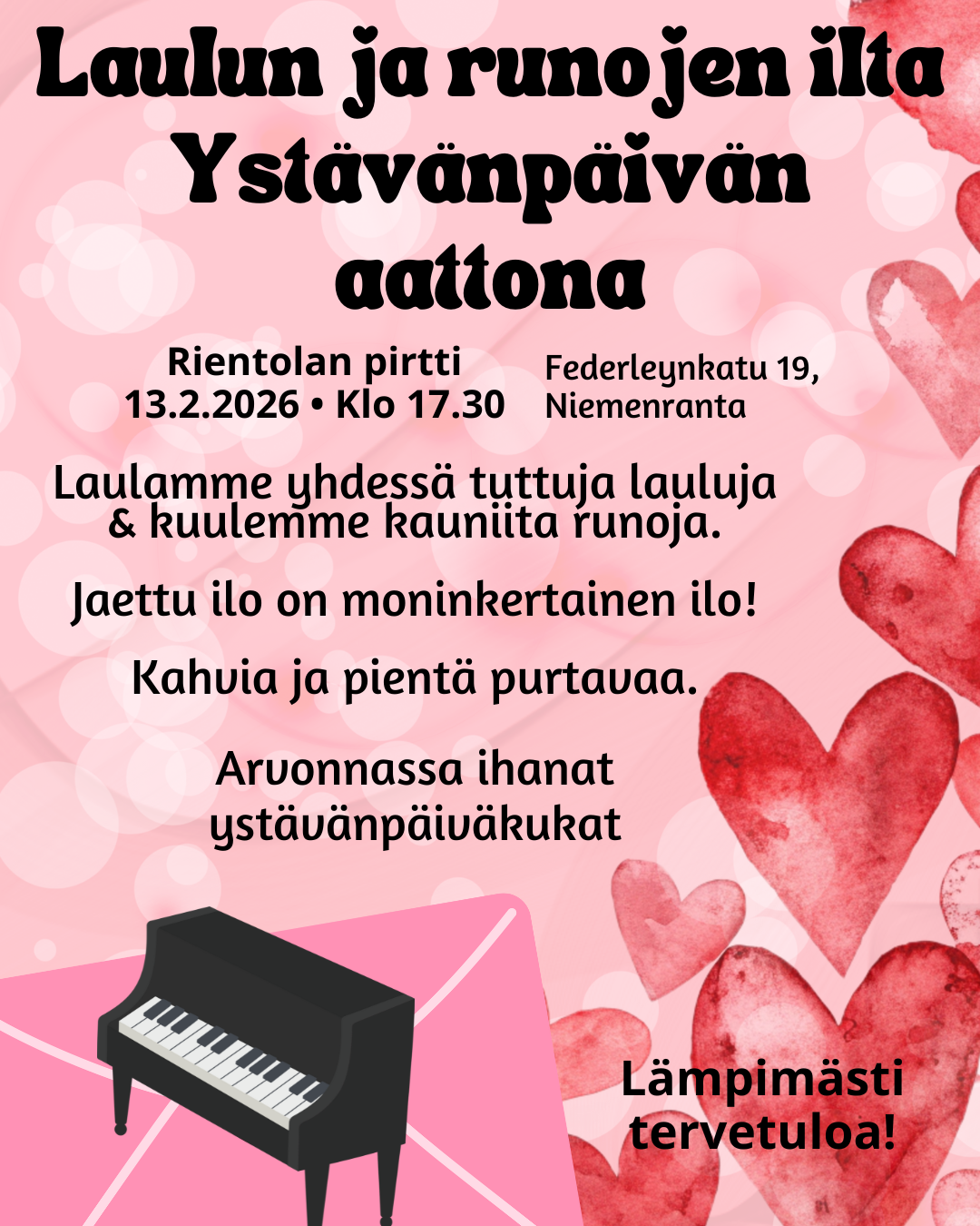 Laulamme yhdessä tuttuja lauluja & kuulemme kauniita runoja. Jaettu ilo on moninkertainen ilo! Kahvia ja pientä purtavaa. Arvonnassa ihanat ystävänpäiväkukat.