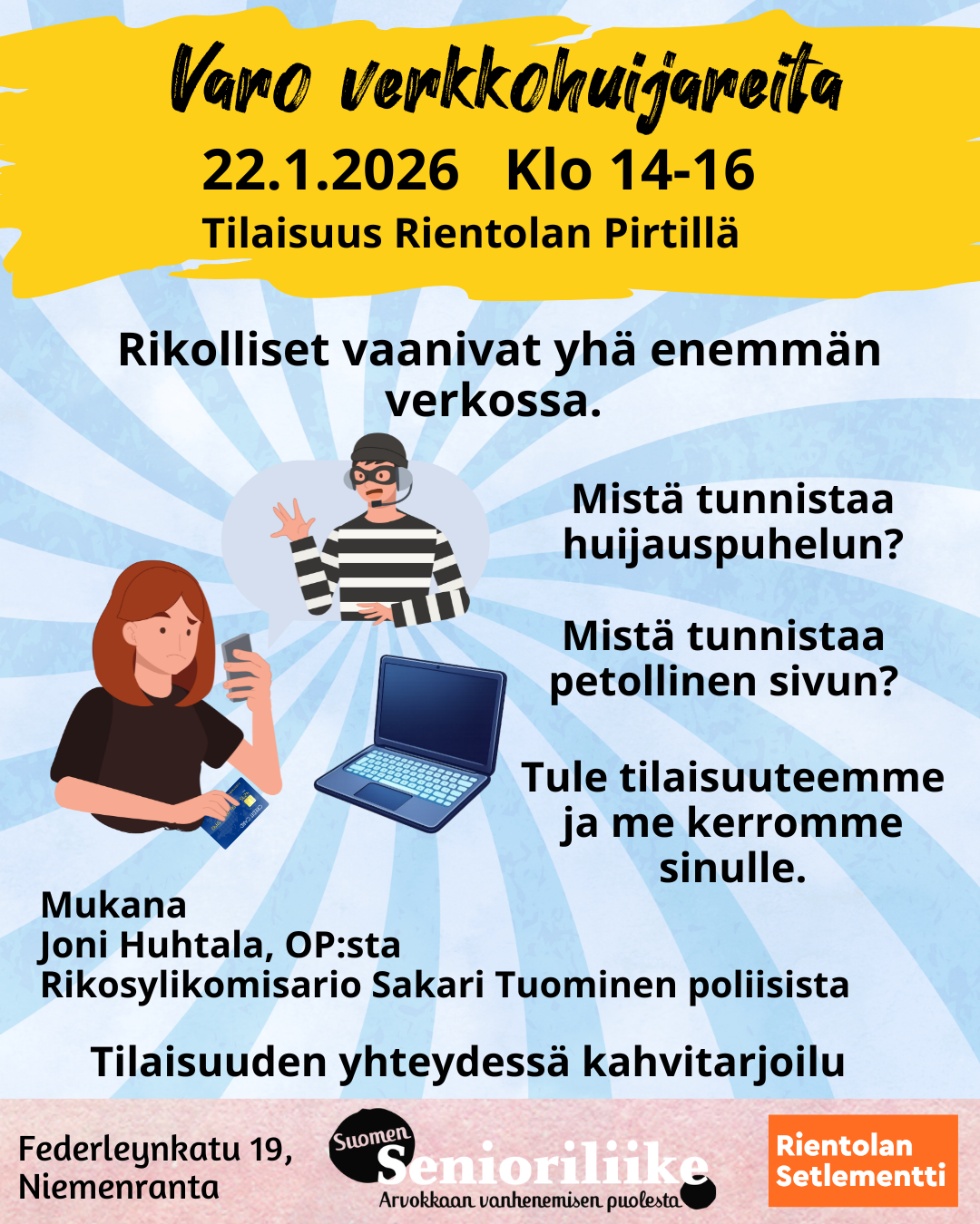 Varo verkkohuijareita-tilaisuus PIRTISSÄ 22.1.2026 KLO 14-16. Miten tunnistaa petollinen sivusto? Entäpä huijauspuhelu? Tule tilaisuuteemme ja me kerromme sinulle. Mukana: Joni Huhtala, OP:sta.…