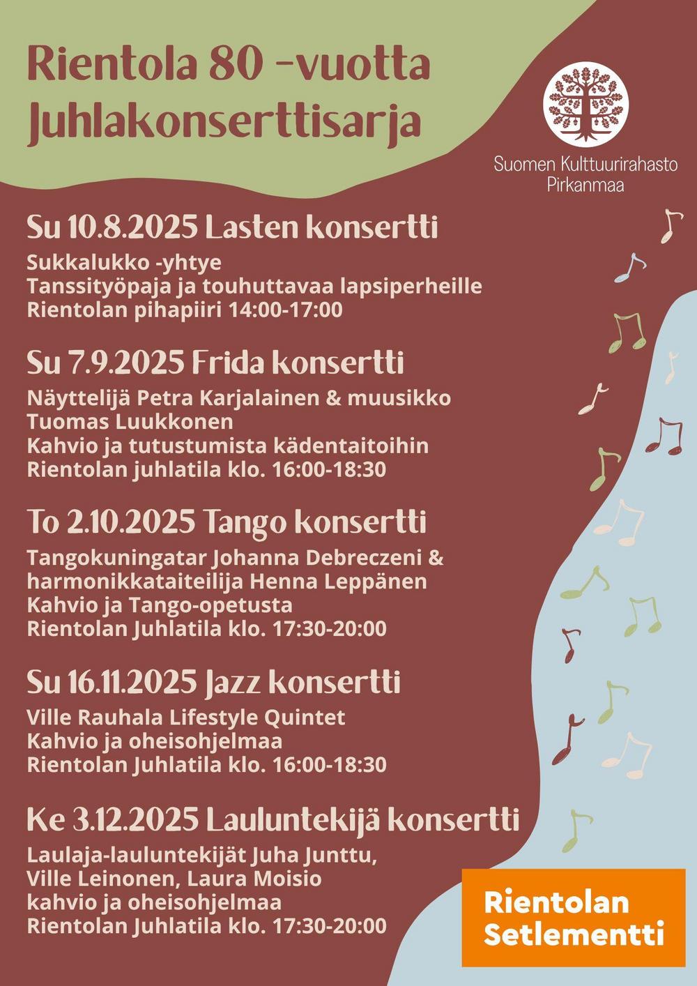 Tämän lisäksi tulevina kuukausina Rientolassa pääsee kuulemaan Frida -näytelmän kauniita lauluja, tanssimaan Tangon tahtiin sekä nauttimaan Jazz-musiikista. Juhlakonserttisarja päättyy joulukuussa lauluntekijäkonserttiin