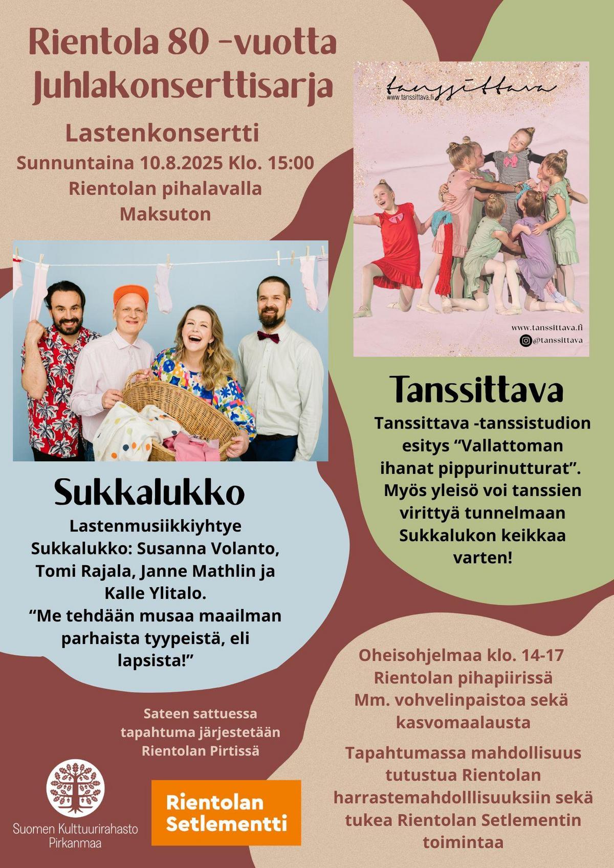 Tervetuloa maksuttomaan perhetapahtumaan Rientolan pihapiiriin sunnuntaina 10.8.2025 klo 14-17. Luvassa mm. Sukkalukko -yhtyeen lastenkonsertti klo 15 ja sitä ennen Tanssittava -tanssistudion tanssiesitys. Lisäksi mm. vohveleita ja kasvomaalausta. Tapahtumassa on mahdollista tutustua myös Rientolan kurssitoimintaan ja tukea Rientolan Setlementti ry:n toimintaa. Lämpimästi tervetuloa viettämään kivaa päivää kanssamme.