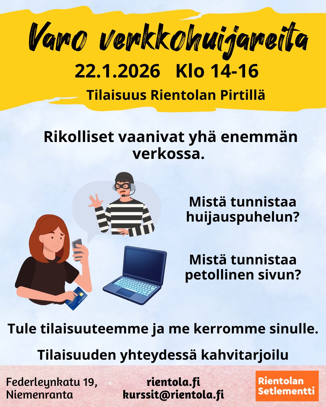 Varo verkkohuijareita-tilaisuus PIRTISSÄ 22.1.2026 KLO 14-16. Miten tunnistaa petollinen sivusto? Entäpä huijauspuhelu? Tule tilaisuuteemme ja me kerromme sinulle. Tilaisuuden yhteydessä…