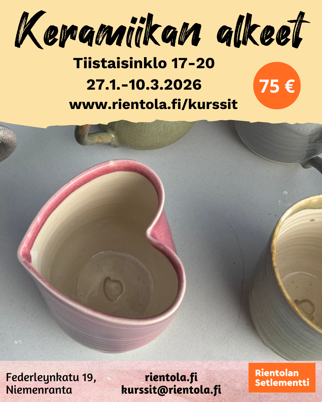 Suuren kysynnän vuoksi olemme järjestäneet lisää "Keramiikan alkeet"-kursseja Uusi kurssi löytyy verkkokaupasta tai osoitteesta https://uusi.pilvikanava.fi/rientola/fi/course/1852/