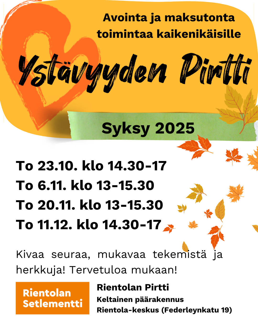 Ystävyyden Pirtti on suunnattu kaikenikäisille lapsille, nuorille ja aikuisille, jotka haluavat viettää yhdessä mukavaa aikaa! Luvassa on kädentaitoja, pelaamista ja muuta mukavaa yhteistä tekemistä. Pirtin yhteydessä tarjoillaan välipala. Tervetuloa mukaan!